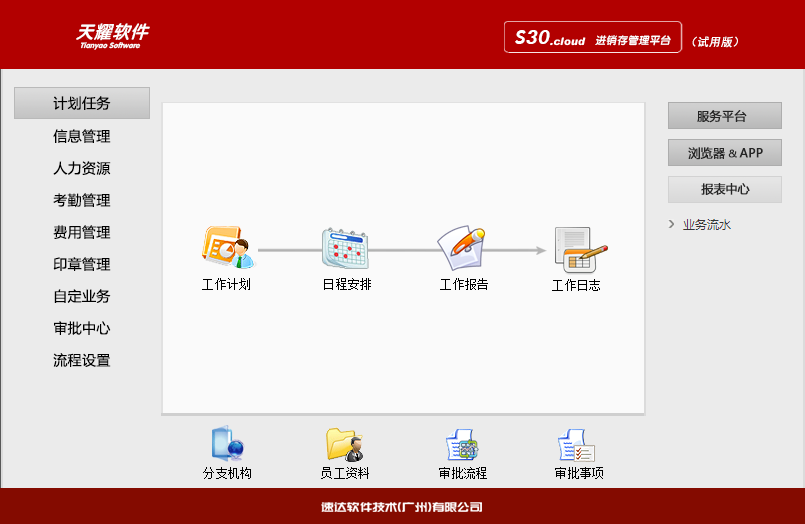部门、职位、员工、权限、地区、客户、商品、审批流程、企业信息、全局账号管理 |