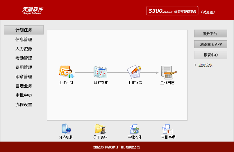 部门、职位、员工、权限、地区、客户、商品、费用项目、审批流程、企业信息、全局账号管理 |